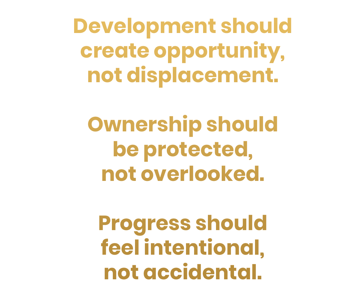 Our work blends real estate, capital, and community strategy so growth is not one-dimensional. Every project is designed to perform in the market while strengthening the people connected to it.